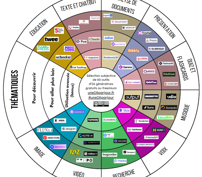 Sélection subjective de 60 outils d’IA génératives gratuits ou freemium en 10 catégories : éducation, texte et chatbot, analyse de documents, présentation, quiz et flashcards, musique, voix, recherche, vidéo et image.