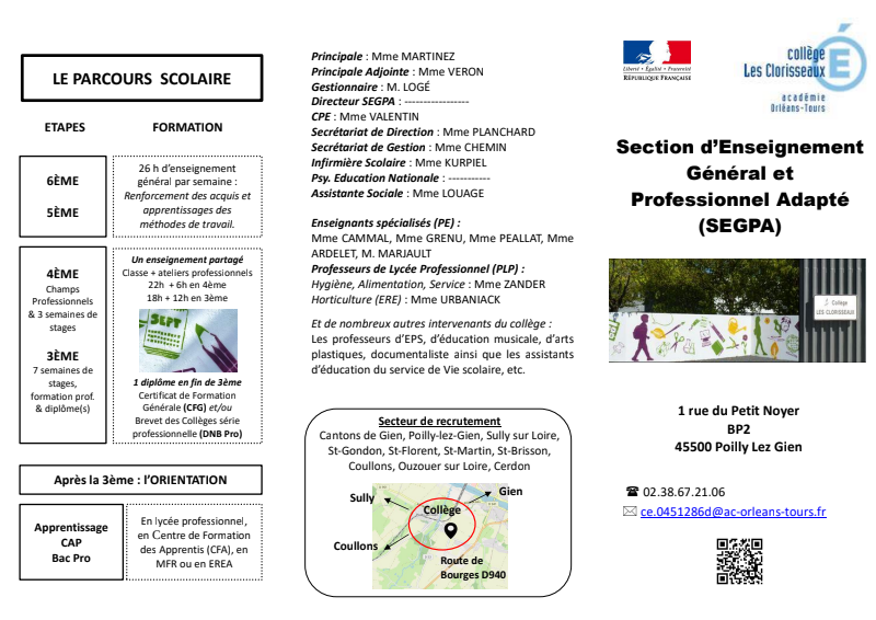 La principale du collège est Mme Martinez, la principale adjointe est Mme Véron, l'infirmière est Mme Kurpiel et les surveillants sont presque tous partis.